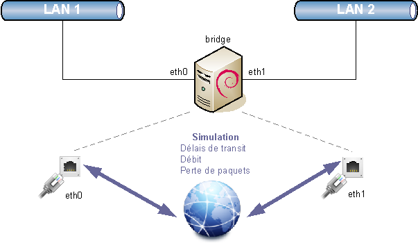 Pour bâtir cette infrastructure, nous avons besoins de deux réseaux LAN (mais deux PC peuvent suffirent) et d’une machine GNU/Linux disposant de deux interfaces réseaux permettant de faire un pont entre ces deux LAN. Le choix d’une architecture en pont (bridgé) permet d’insérer facilement le simulateur dans une architecture réseau existante.