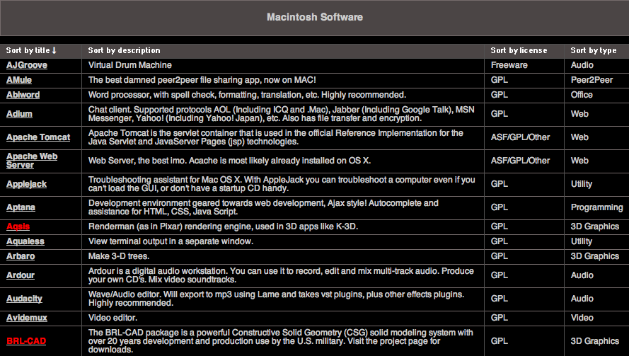 Le page web suivante permet d’avoir une liste assez bien faite de Freeware et GPL pour Mac OS X classée par catégories (Audio, Video, Office, 3D, P2P …).